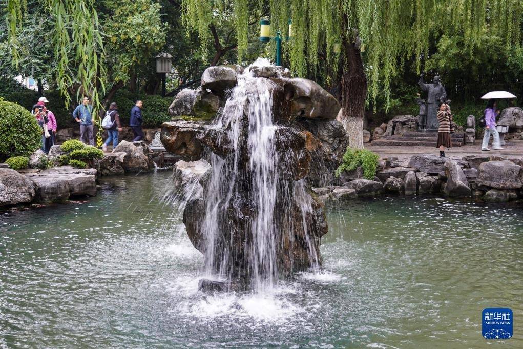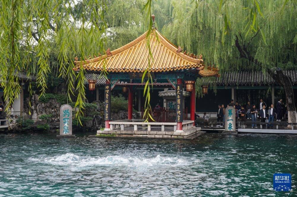 10月15日,游客在济南趵突泉公园观光游览。趵突泉实时水位达到30.32米,刷新1966年以来的最高水位纪录。